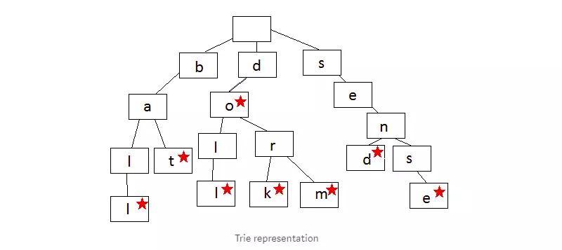 看看上面的图像,你可以构成很多单词。从顶部的根节点开始并往下,这个字典树包含了ball, bat, doll, do, dork, dorm, send, sense这些单词。