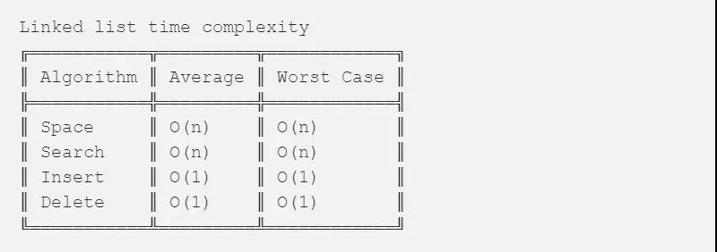 链表中最基本的操作是插入链表、删除链表以及查询链表。下表为链表的时间复杂度: