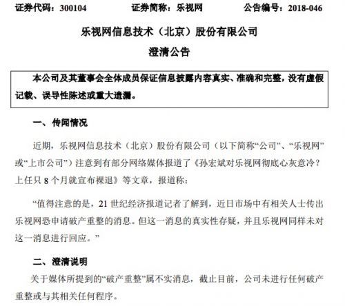 3月16日消息,乐视网晚间发布公告称,关于媒体所提到的“破产重整”属不实消息,截止目前,公司未进行任何破产重整或与其相关任何程序。