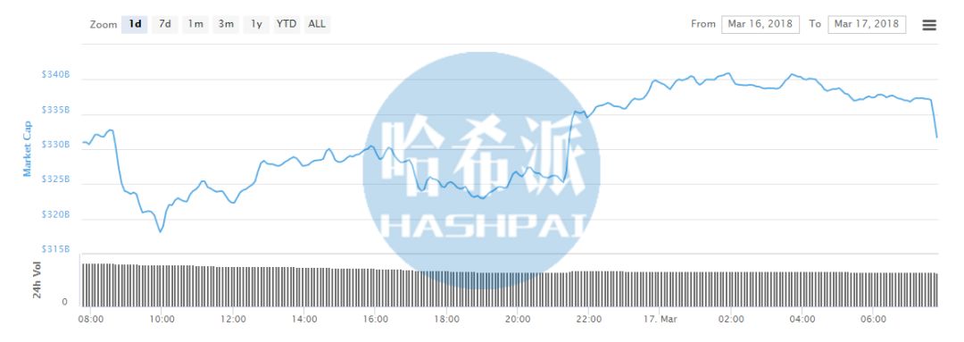 注2:图2是数字货币市场总市值在24小时内的走势变化,该走势反应了当前大盘的总体表现情况。