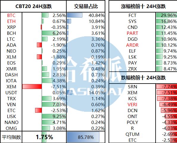 昨日夜间,BTC拉升突破8400美元后又回调。排名前一百的币种中大约有60%据呈现不同幅度的涨幅,其中FCT在24小时内上涨了超过25%,位列涨幅榜榜首,同时后面SYS(16.86%)、CND(12.43%)、PART(11.45%)、DGD(10.96%)以及ARDR(10.12%)也表现不错,涨幅均超过了10%。另一方面,剩下40%逆势下跌的币种中跌幅并不明显,前三名分别是SRN(7.74%)、XEM(7.51%)以及KCS(7.38%),均未超过10%。