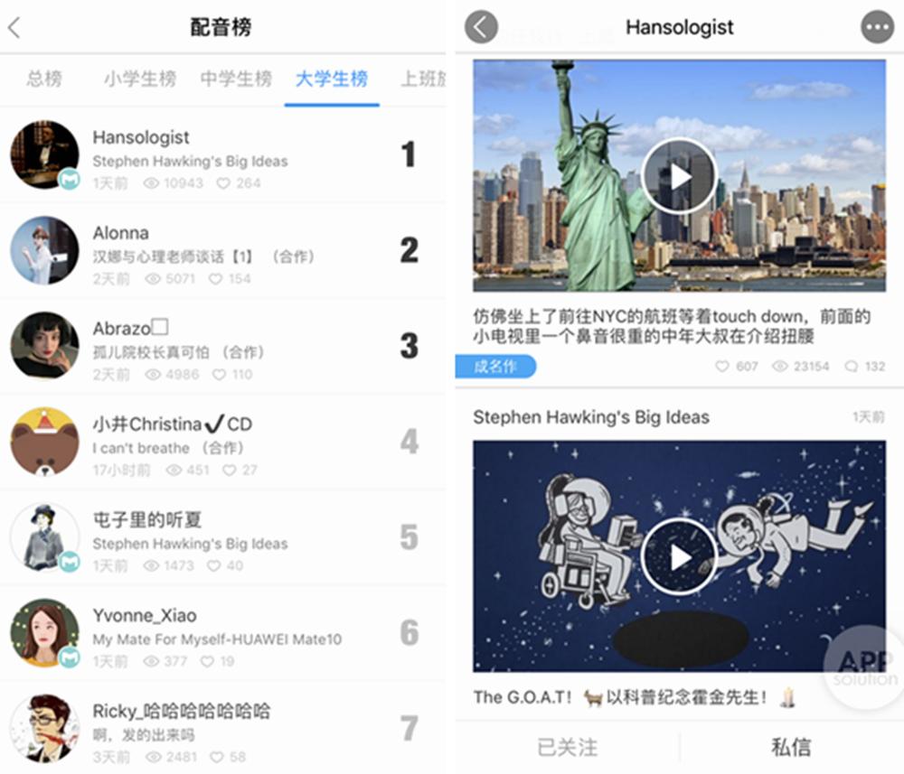值得一提的是,《英语魔方秀》设置了「配音榜」,有大学生榜、高中生榜等,不仅可以发现很多配音大神,还能自己对比一下与我们同年龄段人的配音水平哦!