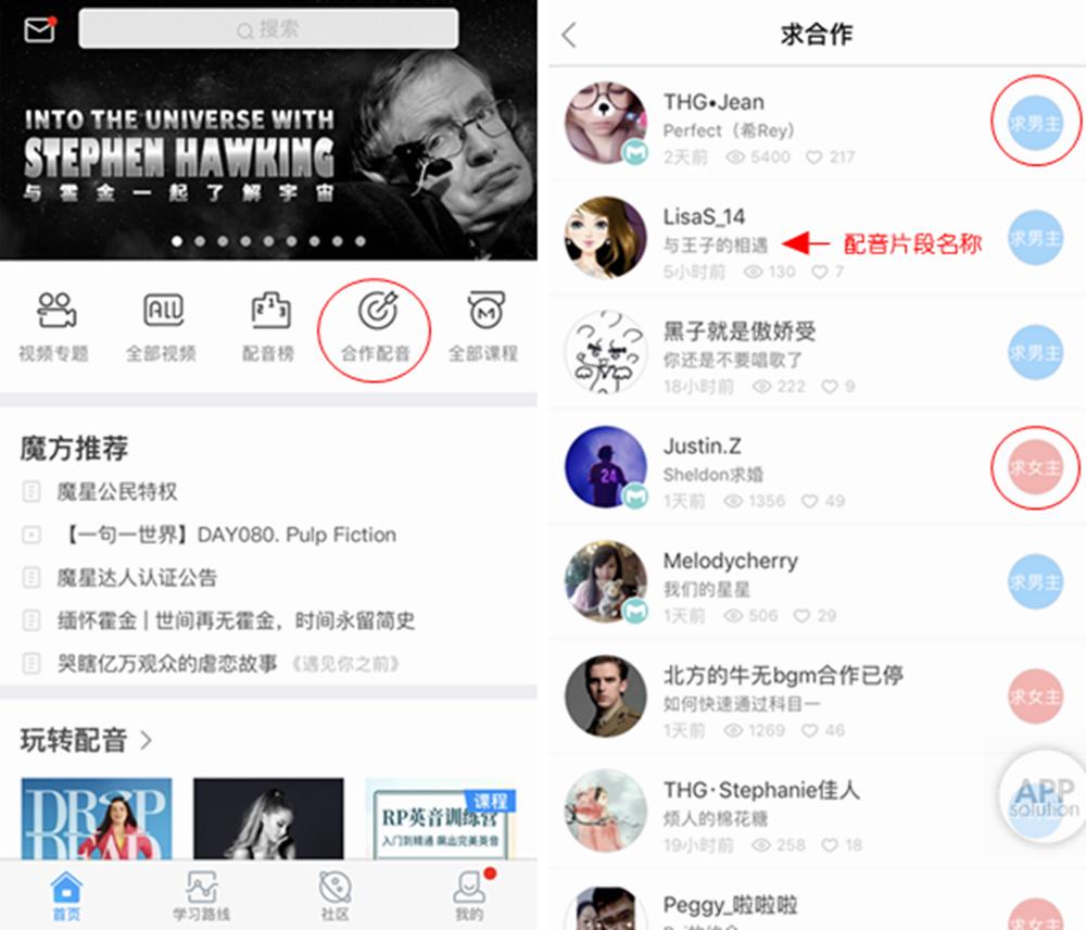 而那些需要合作完成的配音片段,你不仅可以私下找小伙伴一起录,还可以将你的邀请发送在《英语魔方秀》上面。许多优秀的配音作品都是合作产生的哦!