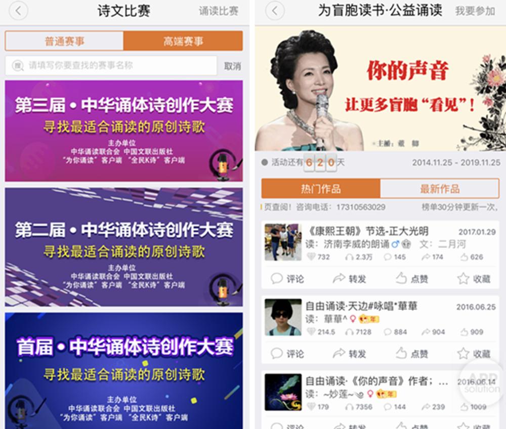 点击「榜单」可以看到许多活动,如主播大赛、诵体诗大赛,更有「为盲胞读书」等公益诵读活动。