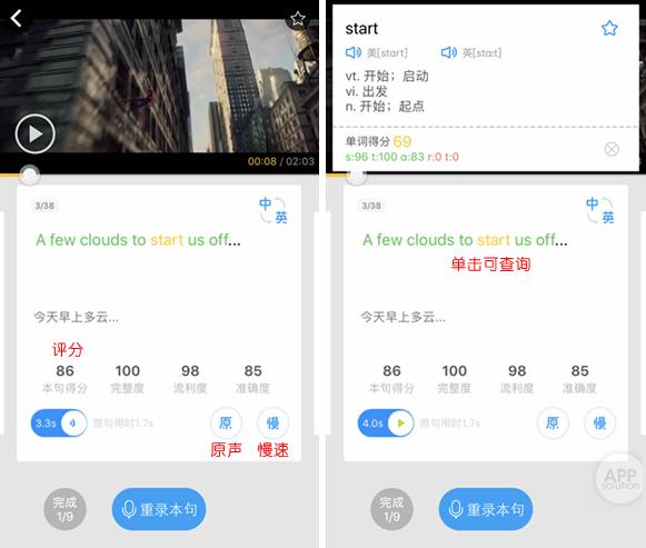分句完成配音作品、点击字幕便可查询生词、慢速播放、即时反馈的口语测评结果,都是它成为我心目中最佳配音 App 的得分点。