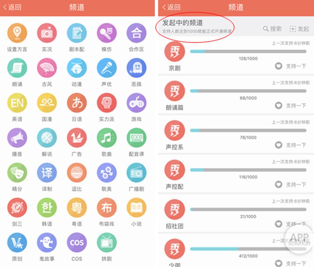 因为《配音秀》中的频道是可以由用户来发起的,只要支持人数达到 1000 就能正式开通该频道。所以,你能在这里看到许许多多有趣但相对小众的频道。