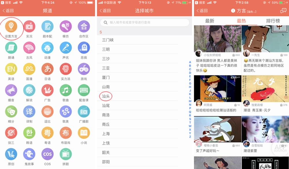 有趣的是,在「设置方言」中选择你的城市,搜索结果就会出现用该地方言配音的视频作品,比如粤语、潮汕话、东北话等。