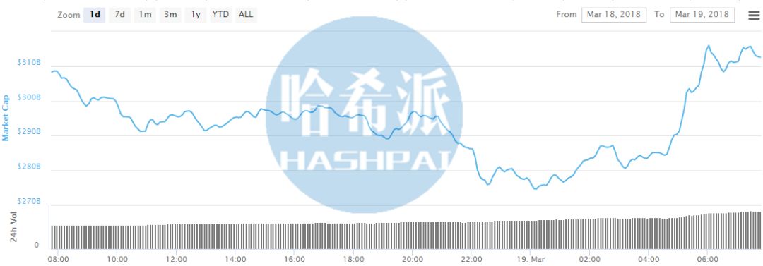 注2:图2是数字货币市场总市值在24小时内的走势变化,该走势反应了当前大盘的总体表现情况。