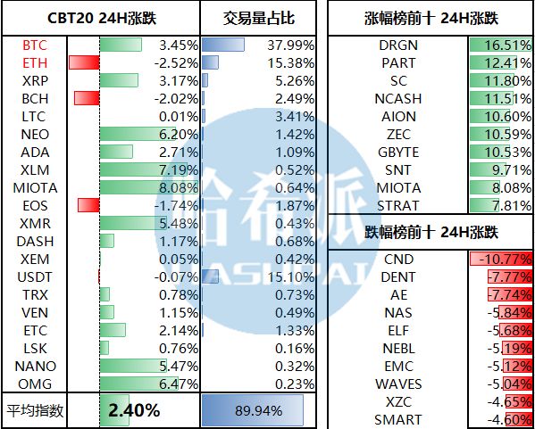 昨日数字货币市场止跌反弹,目前市值为3128.32亿美元。CBT20平均涨幅2.4%,BTC涨幅(+3.45%),而其他涨幅较大的有MIOTA(+8.08%)、XLM(+7.19%)、OMG(+6.47%)、NEO(+6.20%);虽然ETH较昨晚最低点已反弹超过10%,但较24小时前同期仍然略有下跌,跌幅2.52%,BCH(-2.02%)和EOS(-1.74%)的情况也类似。而市值前100币种行情则呈两级分化,涨跌参半,涨幅榜中平均涨幅11%,涨幅较大的有DRGN(+16.51%)、PART(+12.41%)、SC(+11.80%);跌幅榜中平均跌幅6.2%,跌幅较大的有CND(-10.77%)、DENT(-7.77%)、AE(-7.74%)。