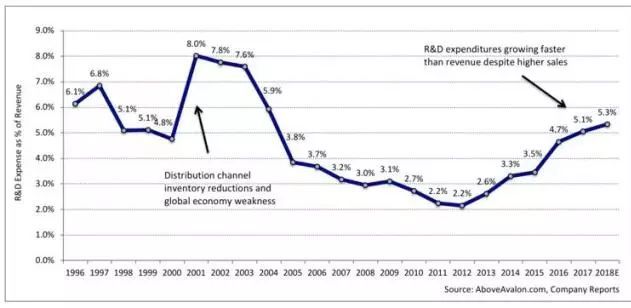 据外媒报道,苹果公司预计2018年的研发费用高达140亿美元,在4年时间里增长了近2倍,占营收比例达到了14年来最高,这凸显了苹果不断增长的产品野心。