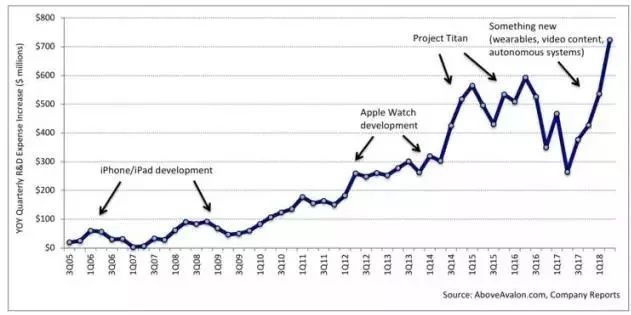 这对于天才计算机大师艾伦·凯(Alan Kay)来说,新的转折在于:真正认真对待软件的人应该制造自己的硬件。我们正在转向这个方向,严肃对待软件的公司应该设计他们自己的硅芯片。拥有2850亿美元的储备现金,苹果有了追求这一宏伟目标的自由。正是这种动机——在进军新行业的同时控制更多的用户体验,推动苹果研发支出的显著增长。