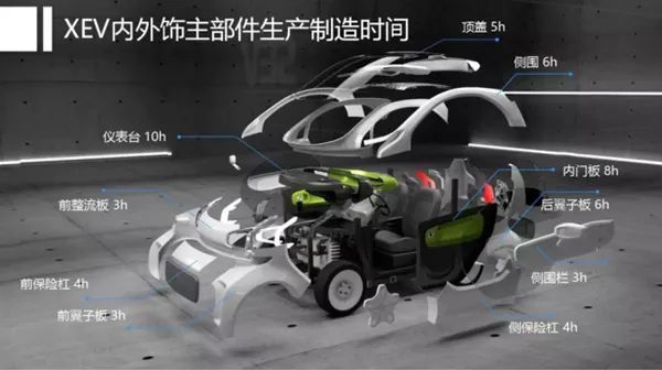 因此,我们可以想象XEV未来的生产线形态,一条生产线两侧汇集了若干台大型3D工业打印机,这些打印机不间断工作,将不同的例如车门、车身、车前盖、后备箱盖等部件打印出来,随后生产线上来来回回的机械臂直接将这些打印好的部件汇聚到总装车间进行总装,一台“LSEV”电动车随之下线。