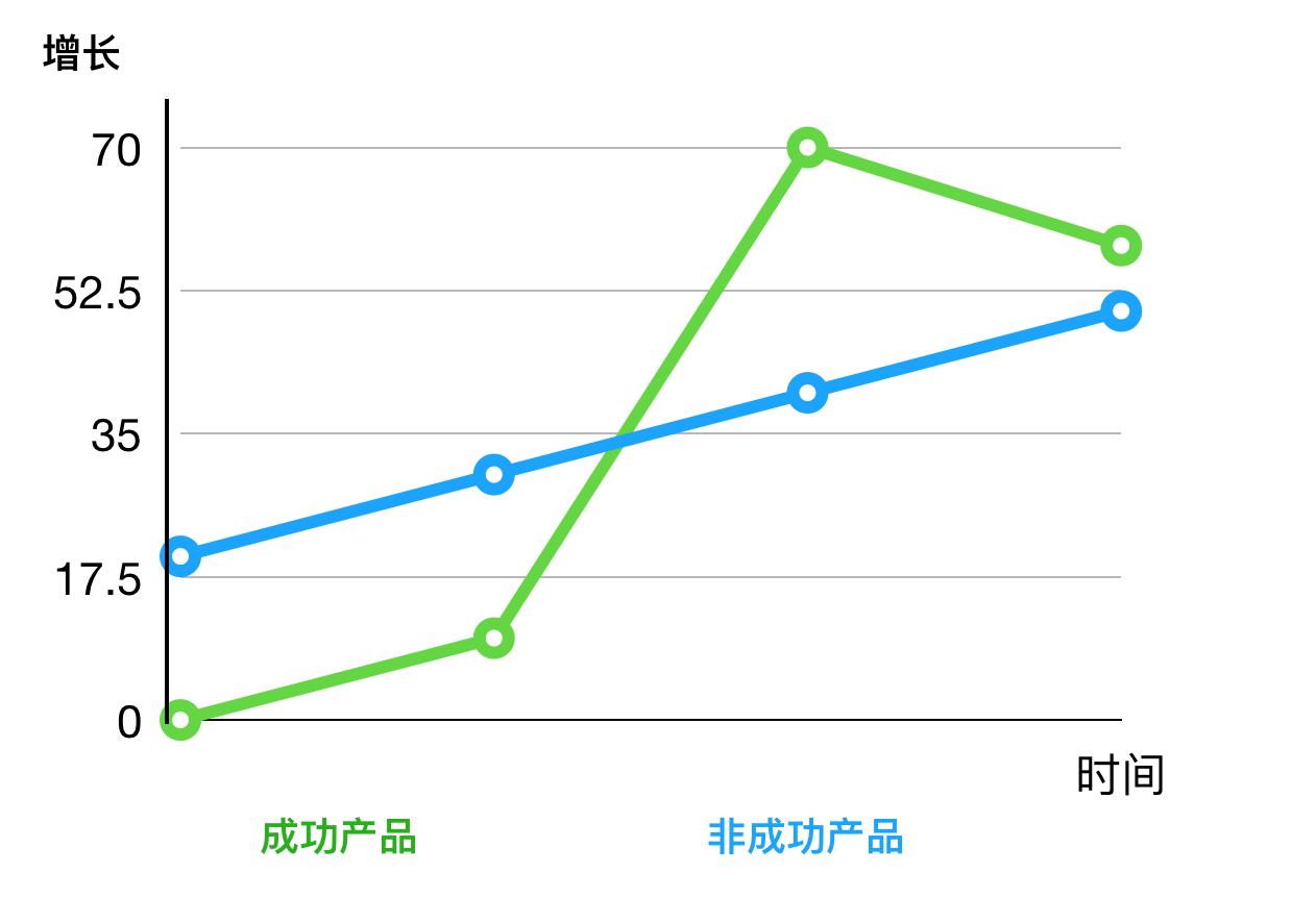 成功的的产品不是45度角的,因为这种增长一般属于上市成熟的企业,但是作为一个科技网络产品,只有遇到图中绿色部分每个版本节点要么变得更好,要么变得更坏,才会使得产品迅速获得用户增长或者迅速发现方向不对需要调整。