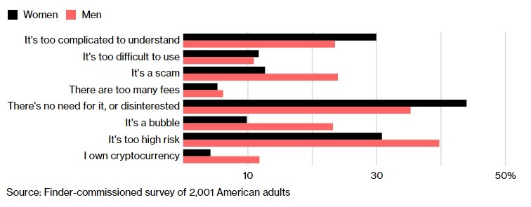 对于“加密货币是否是个骗局?”这个问题,男性回答“是”的比例是女性的两倍。