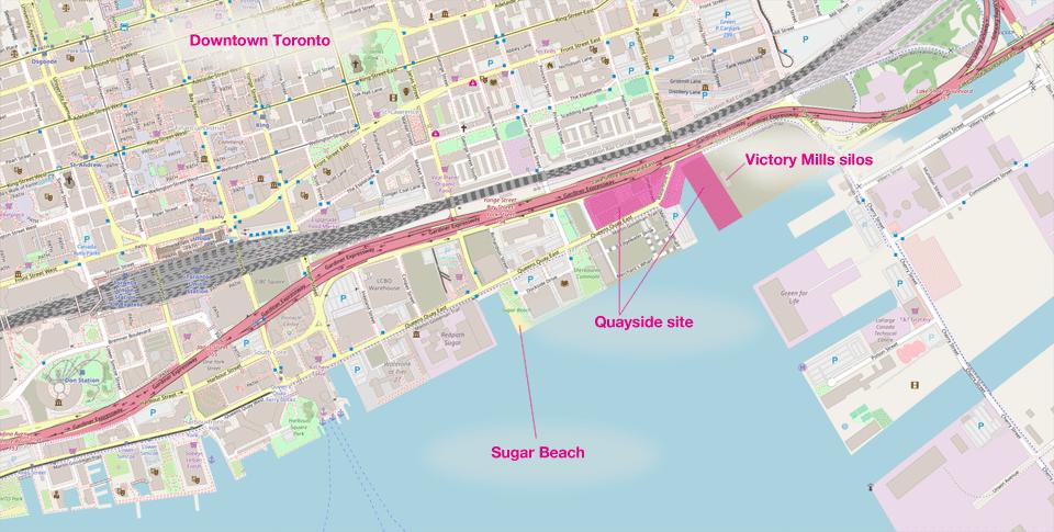 Quayside及周边地区。多伦多市区在左上方。(Open Street Maps / Ian Bogost / The Atlantic)