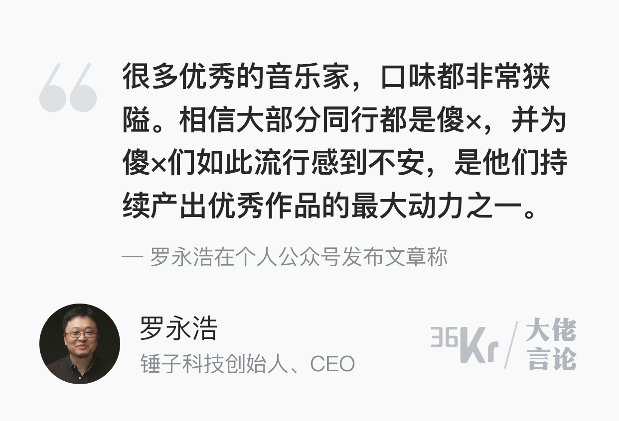 3月20日早上7点,罗永浩在其个人公众号上发布了一条由锤子便签编辑的文章。文章中写道:很多优秀的音乐家,口味都非常狭隘。相信大部分同行都是傻×,并为傻×们如此流行感到不安,是他们持续产出优秀作品的最大动力之一。