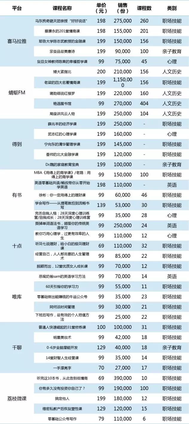 各大知识付费平台Top1课程(数据来源:各大平台披露数据、新知榜,制图:华映资本)