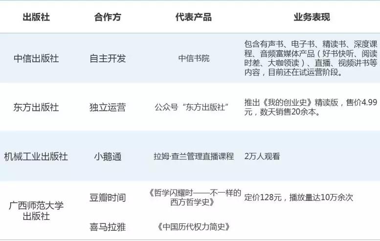 同样,在出版机构领域,不少出版社也开始寻找适合自身的转型方式来拥抱知识付费带来的机遇和挑战。