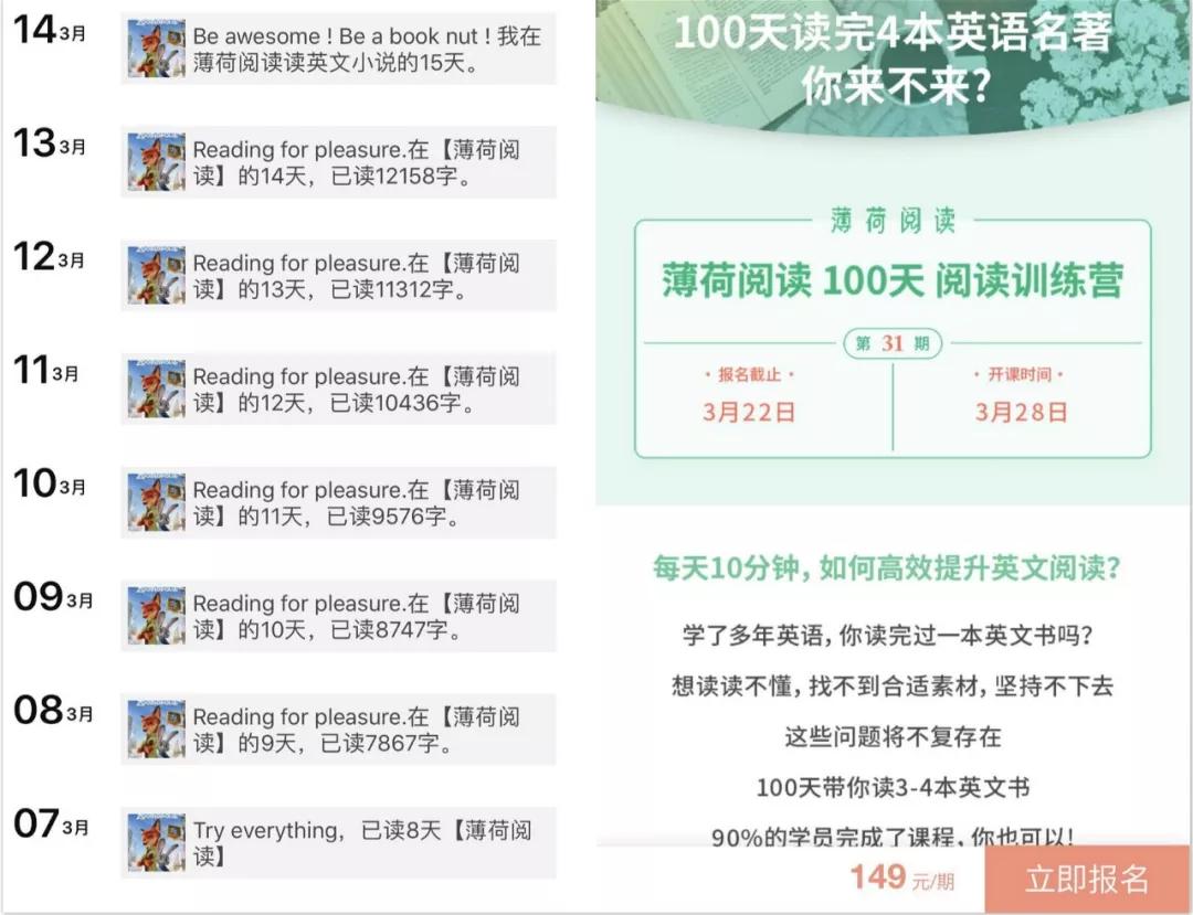 相信17年的朋友圈,大家都能看到一个打卡的分享,“我在薄荷阅读,坚持英文阅读”。病毒式的打卡刷爆朋友圈,让没有读英文的用户心痒痒的,不断转化一批批付费用户。薄荷阅读并不是真的会带给每个人真实的英语学习效果,但带给了“坚持学习的动力”和“学生时代的回忆”。