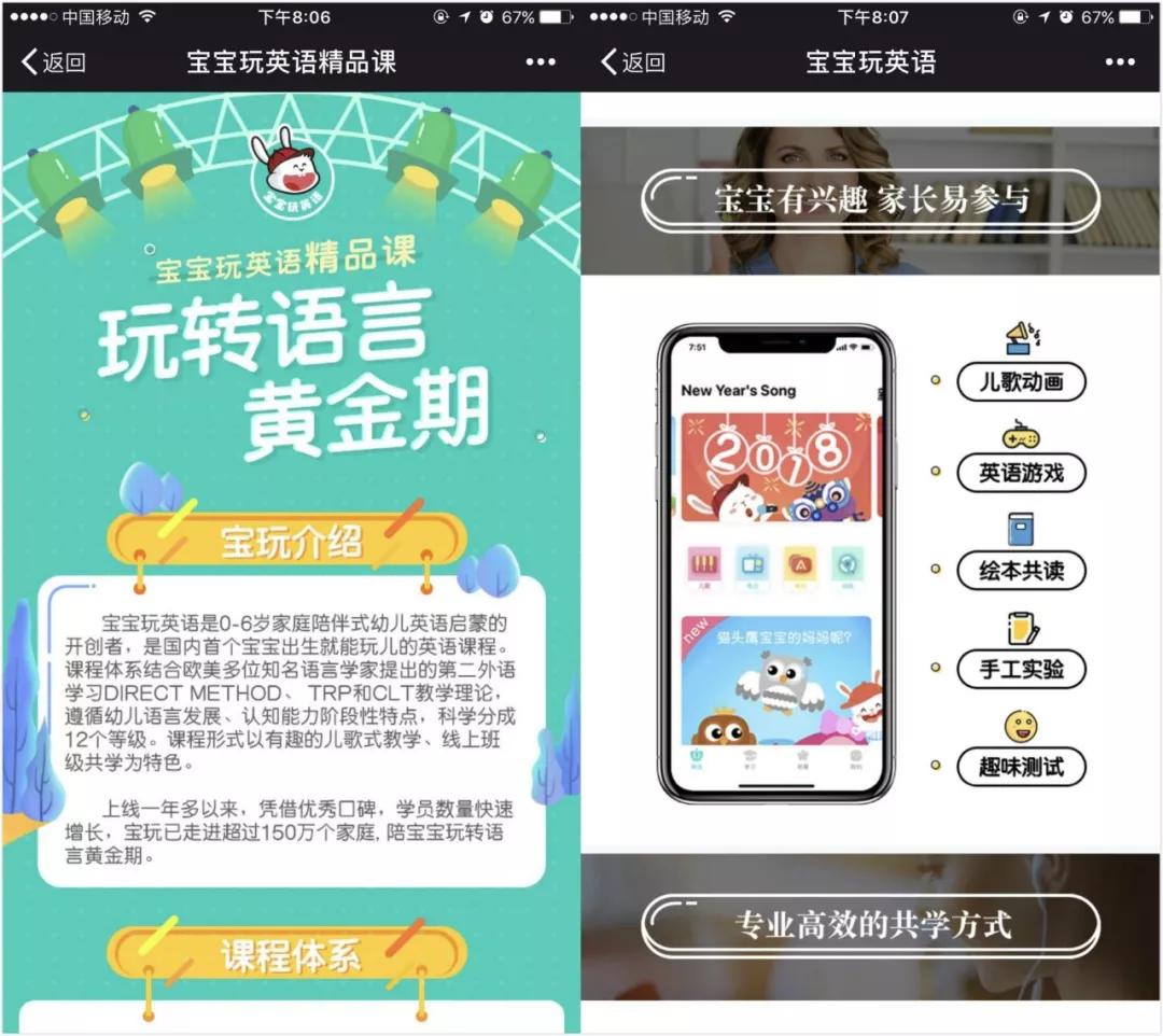宝宝玩英语主要将年轻妈妈群体变成KOL,进行微信生态流量转化。去年曾被指涉嫌传销的“宝玩”,在短时间内聚集了4000人的推广妈妈,将月营收从百万量级提升到了3000万级别。