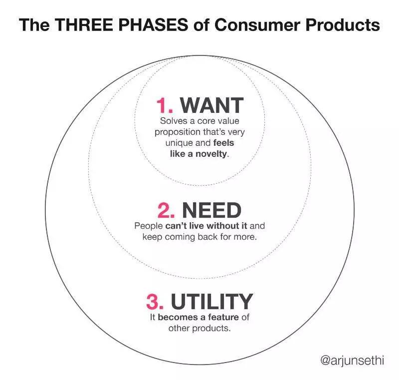 在接下来的一到两年中,短视频行业也将出现这种 “基础设施” 式的存在。这对于产品本身的要求将会相当高。按照 Social Capital 合伙人 Arjun Sethi 提出的产品方法论,一款成功的产品需要经历三个阶段: