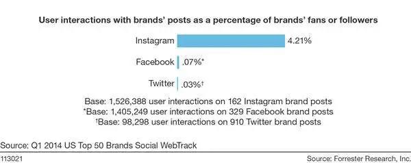 Forrester 的研究结果:4.21% 的 Instagram 用户会点赞品牌内容。 Facebook 是 0.07%。twitter 则是 0.03%。