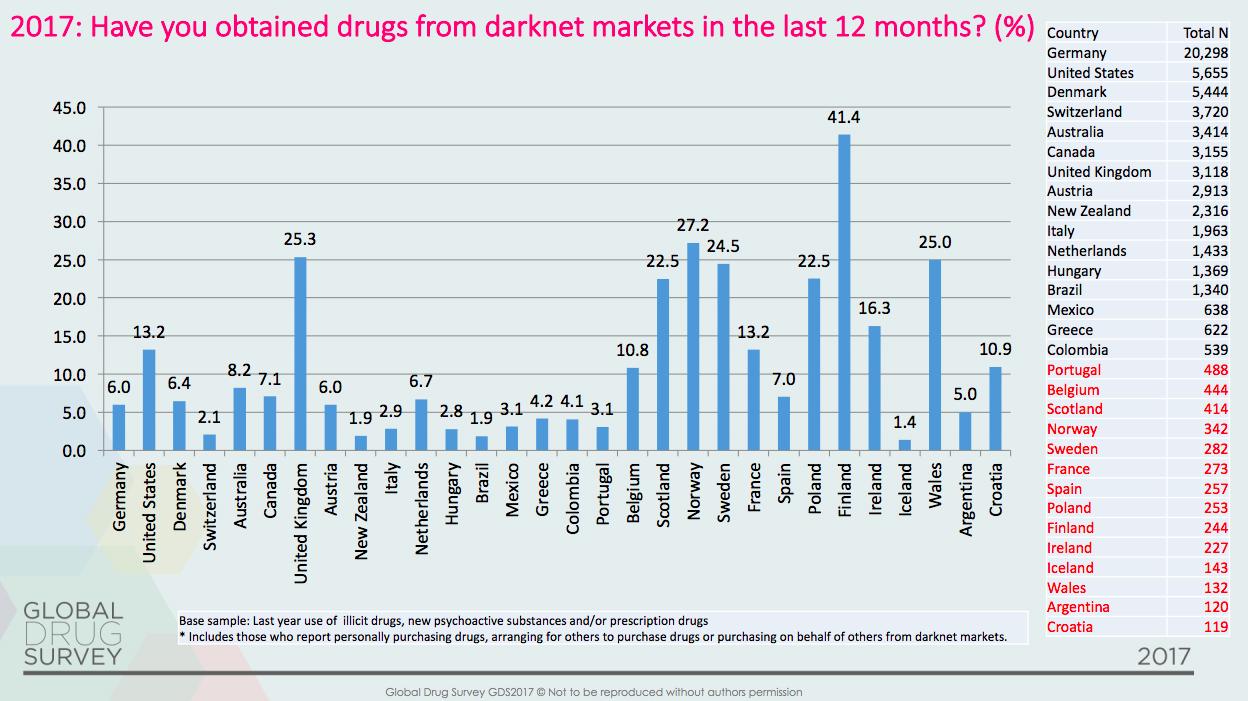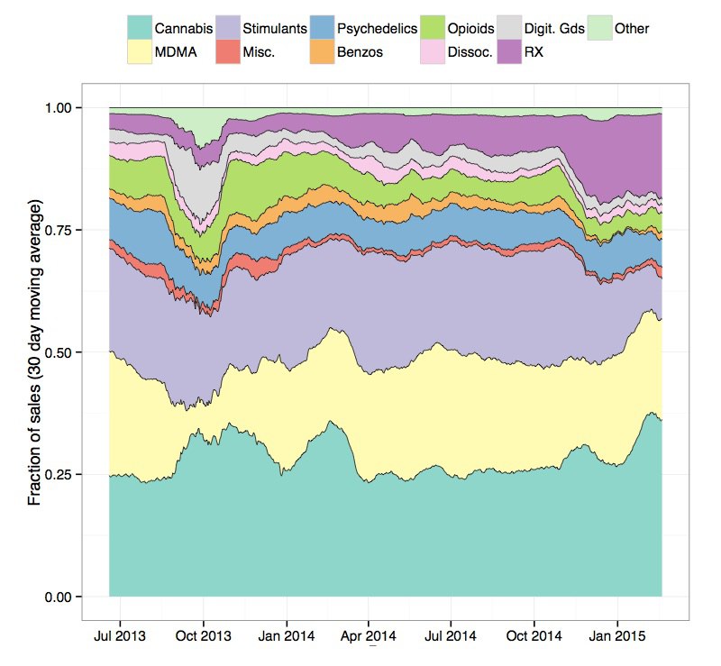 毒品的交易相对来说就比较寻常了。根据 Christin的研究,摇头丸和大麻各占到暗网销售比例的25%。而其他的物品包括那些可以随身携带的毒品、电子产品、烟草、伟哥以及类固醇,这些东西大概占到销售额的3%。