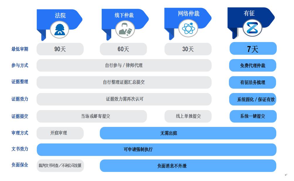 有征创始人兼董事长邢东岩介绍,有征先与金融机构或网贷平台的法务部门共同梳理业务的证据链条,然后在每个业务关键点嵌入API接口收集证据,系统会自动筛选逾期客户,将证据内容发送给仲裁委,智能发起仲裁。