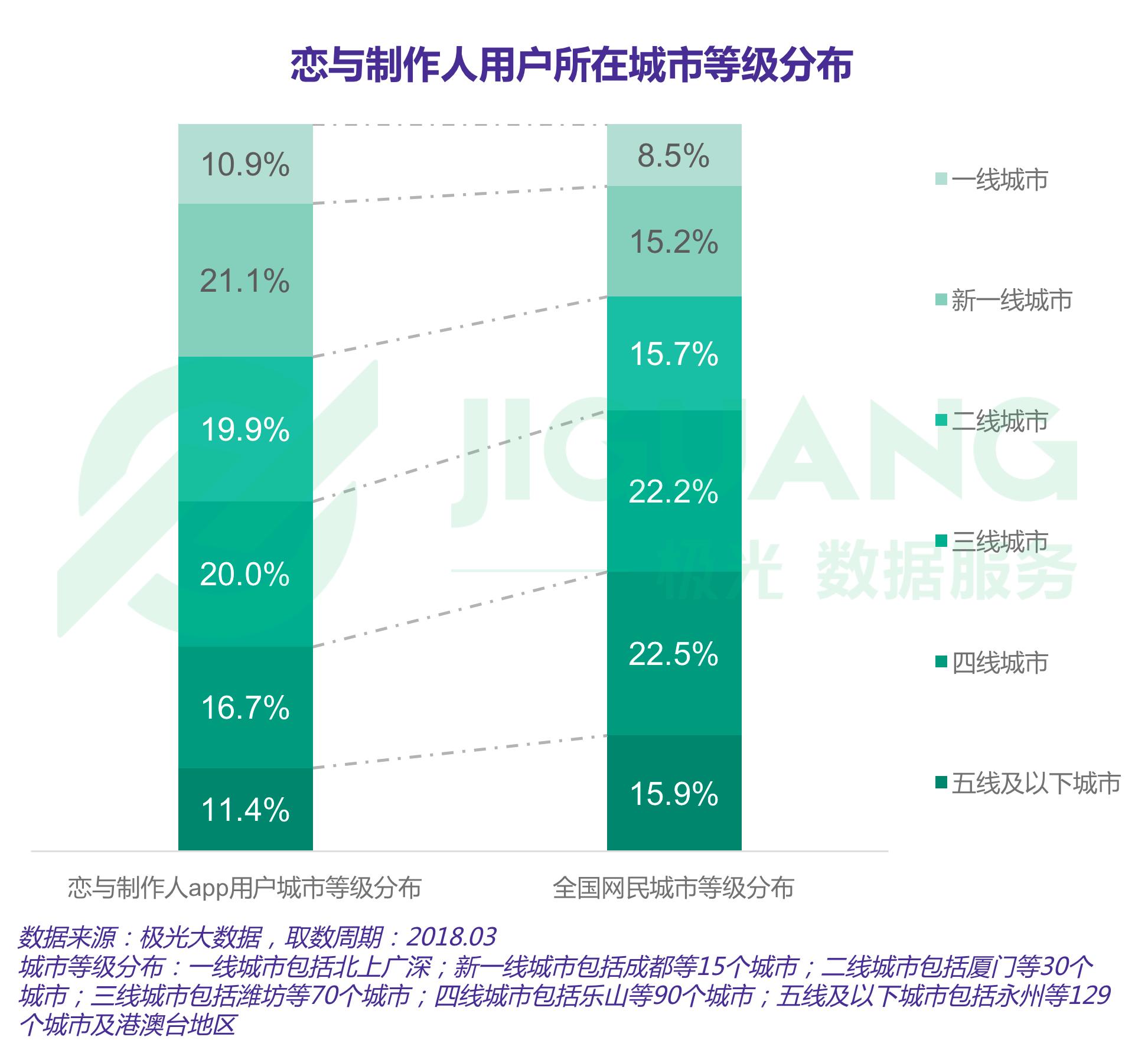 根据极光大数据显示,恋与制作人用户中32%来自一线或新一线城市。