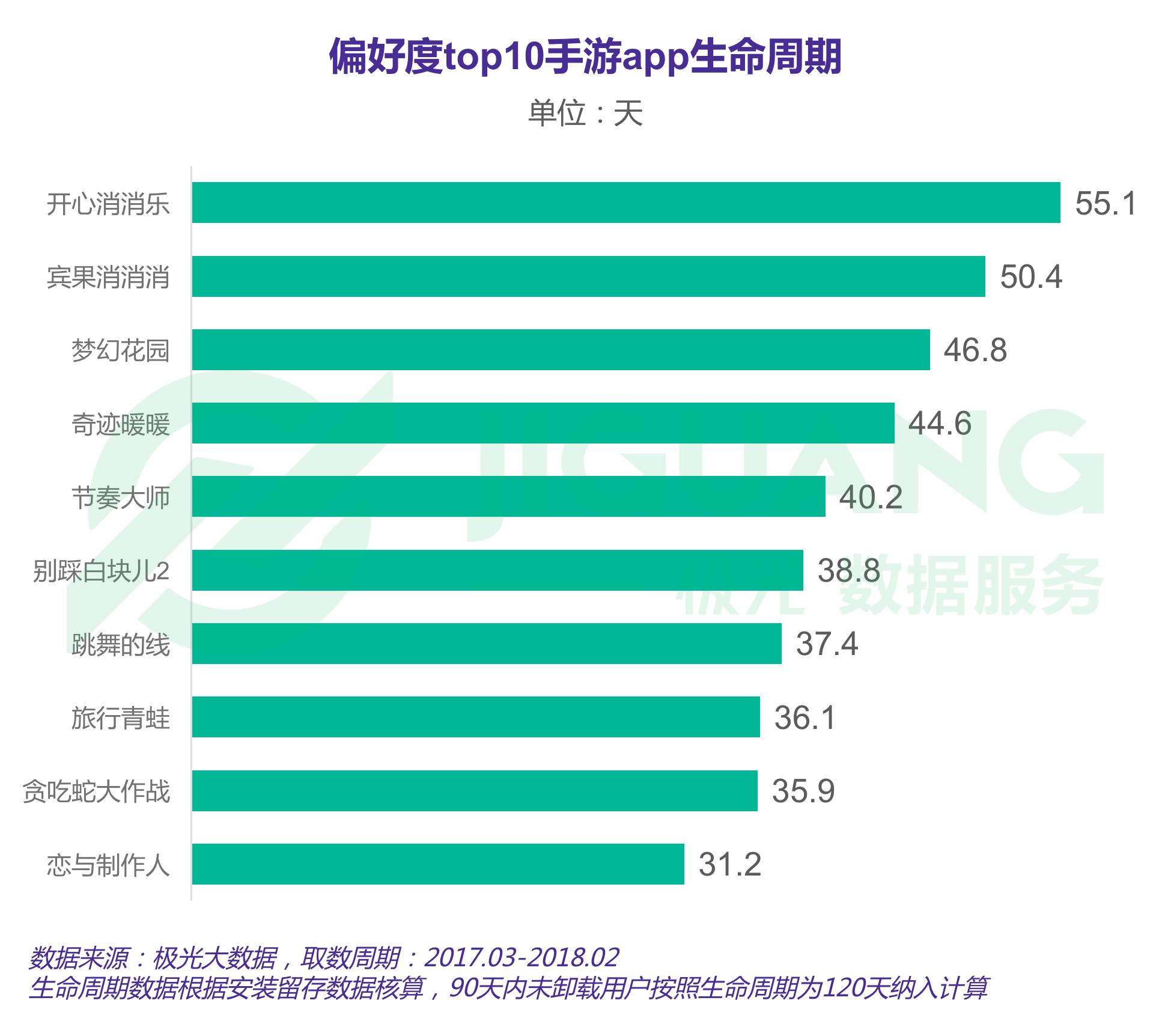 根据极光大数据显示,开心消消乐和宾果消消消生命周期均在50天以上,梦幻花园生命周期为46.8天。