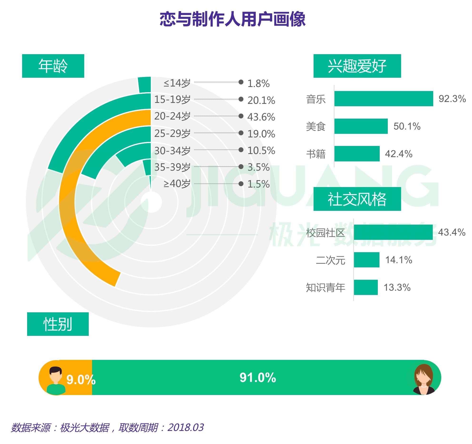 极光大数据发现,恋与制作人用户中43.6%为20-24岁,女性用户占比91%。