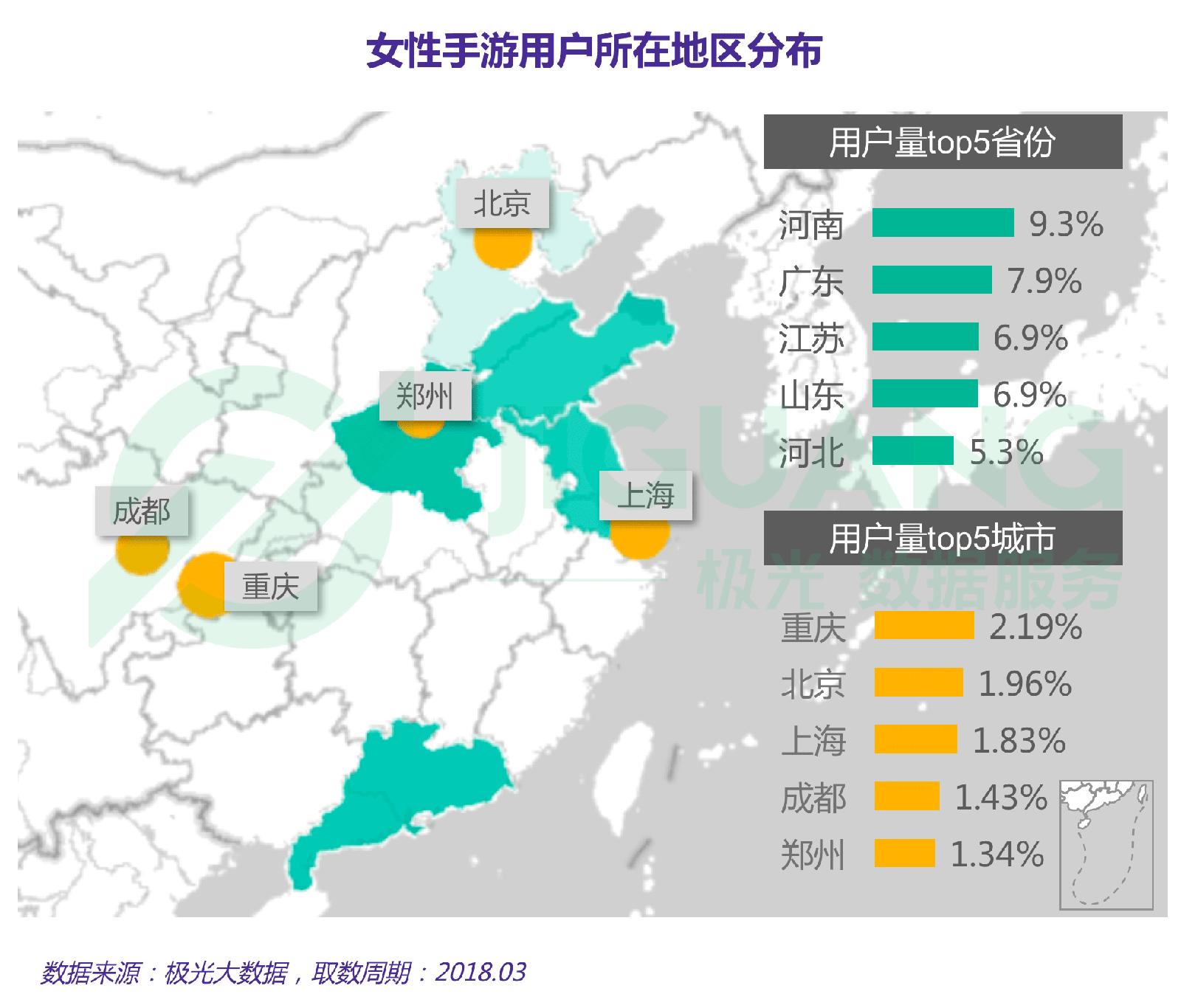 极光大数据显示,重庆、北京和上海为女性手游用户占比top3城市,而河南省是女性手游用户第一大来源省份。