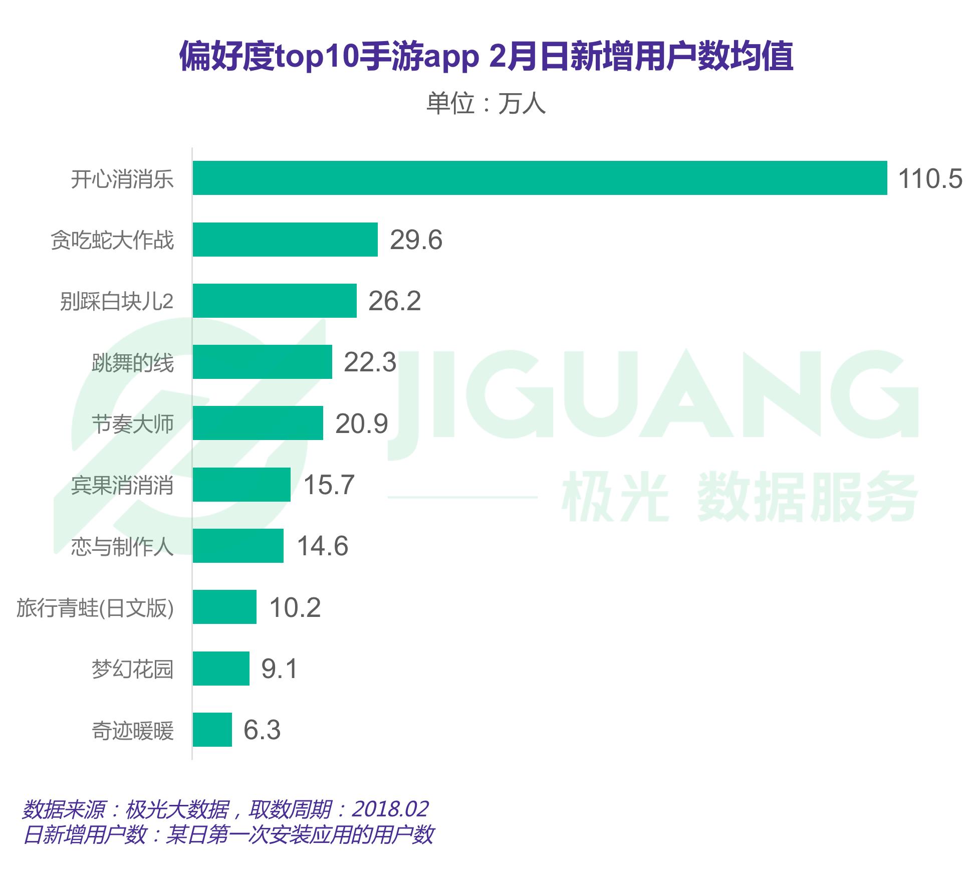 根据极光大数据统计,2018年2月,开心消消乐日新增用户数均值为110.5万,贪吃蛇大作战为29.6万,别踩白块儿2为26.2万。