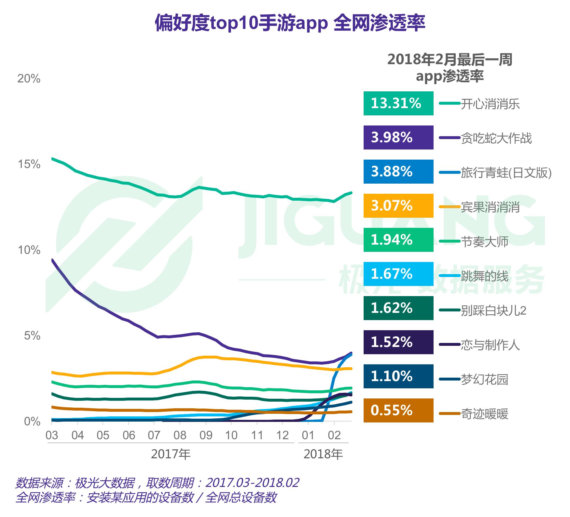 极光大数据发现,截至2018年2月,女性用户偏好度top10的手游app中,开心消消乐全网渗透率为13.31%,贪吃蛇大作战全网渗透率为3.98%,旅行青蛙(日文版)全网渗透率为3.88%。