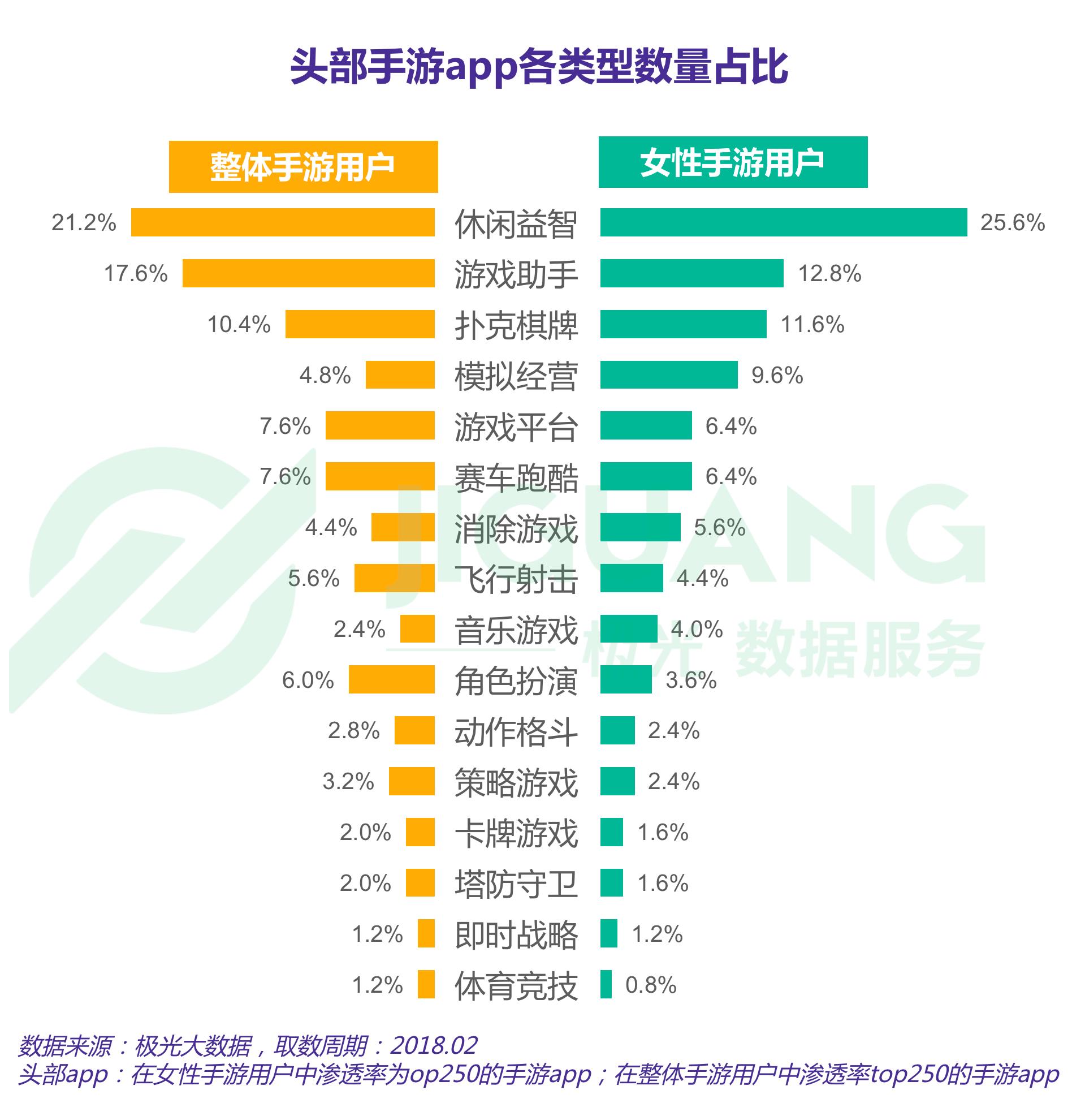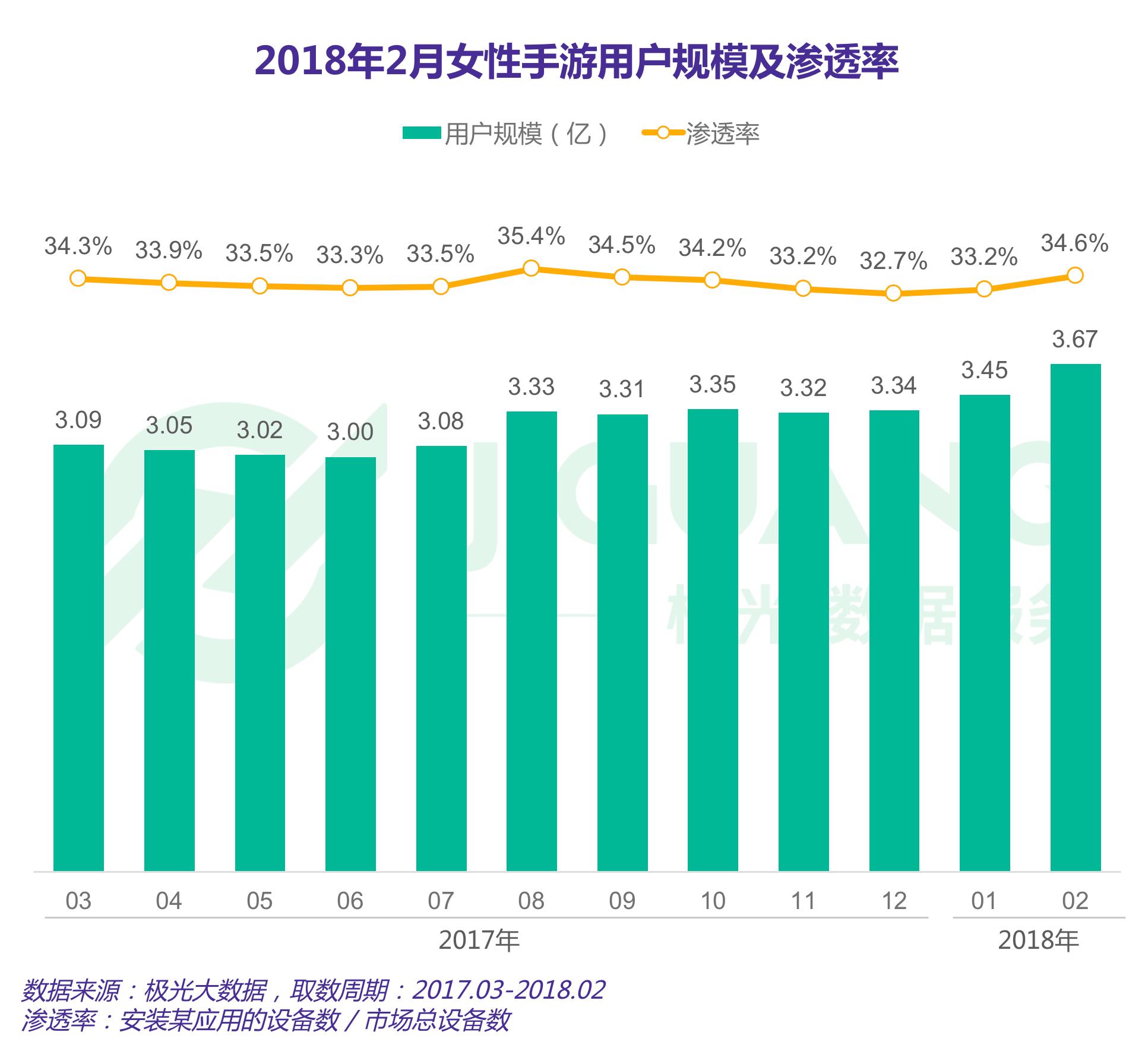 1. 截至2018年2月最后一周,女性手游用户渗透率为34.6%,用户规模达3.67亿