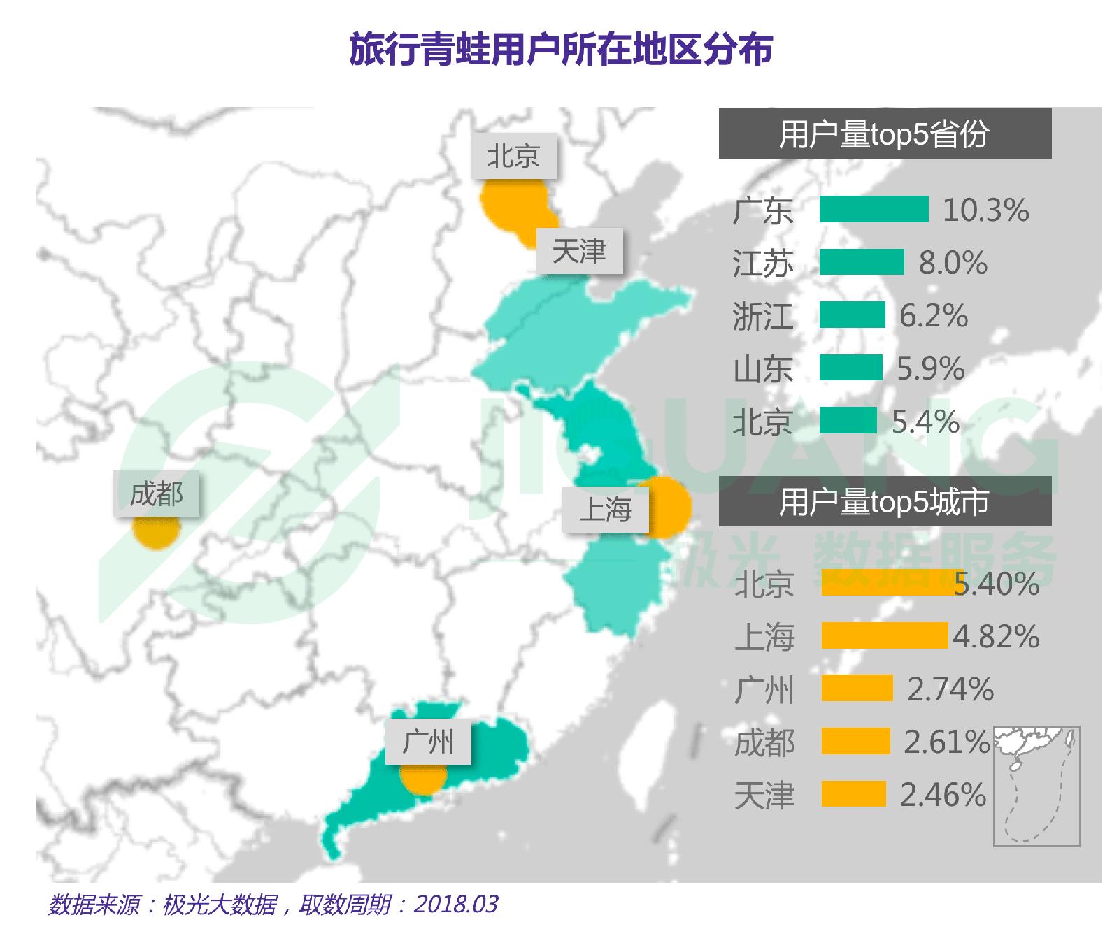 根据极光大数据统计,北京、上海和广州为旅行青蛙用户占比top3城市,广东则是旅行青蛙用户最集中的省份,其用户占比为10.3%。