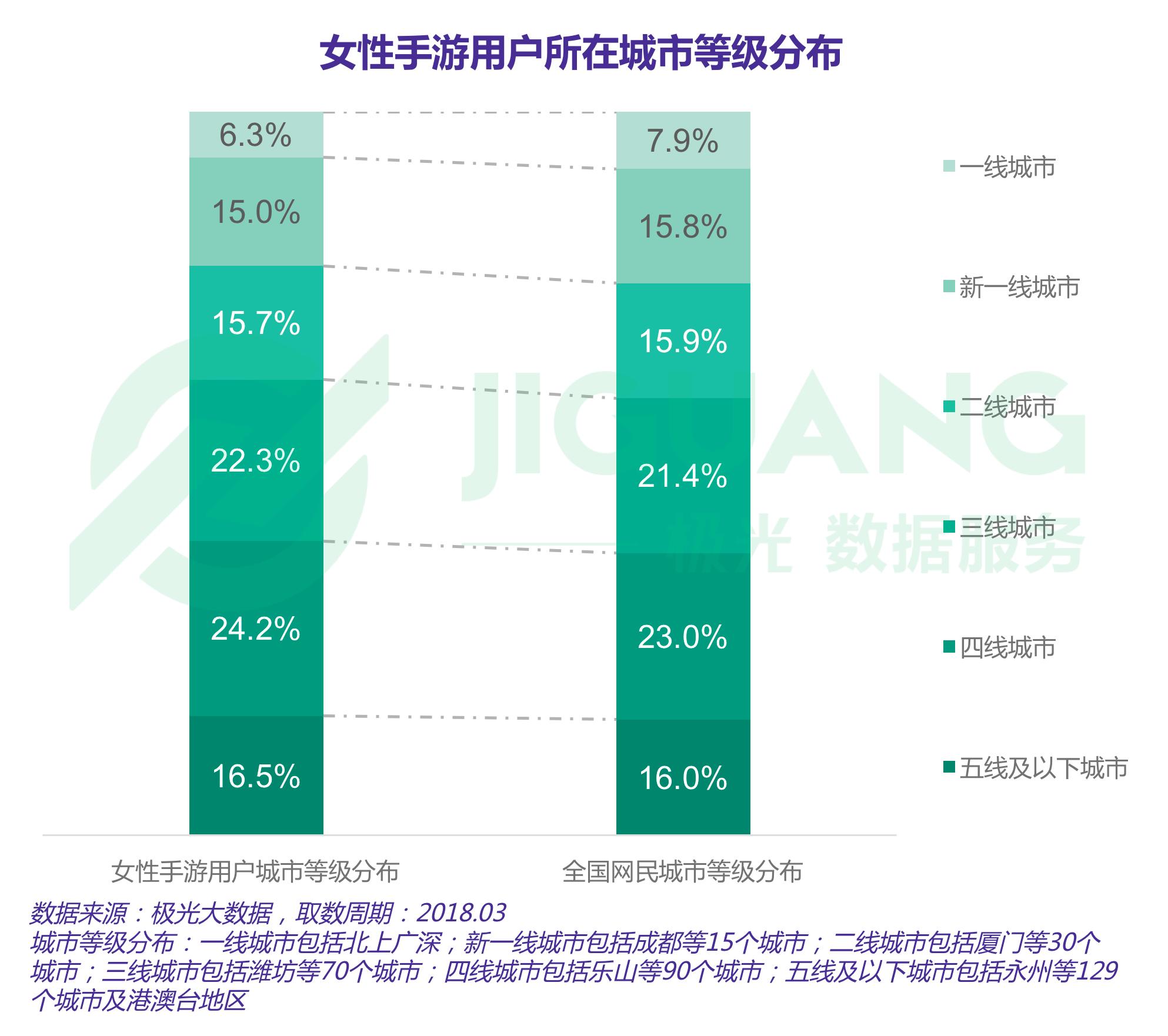 极光大数据发现,女性手游用户在中小城市更为集中。63%女性手游用户来自三线及以下城市,6.3%来自一线城市。