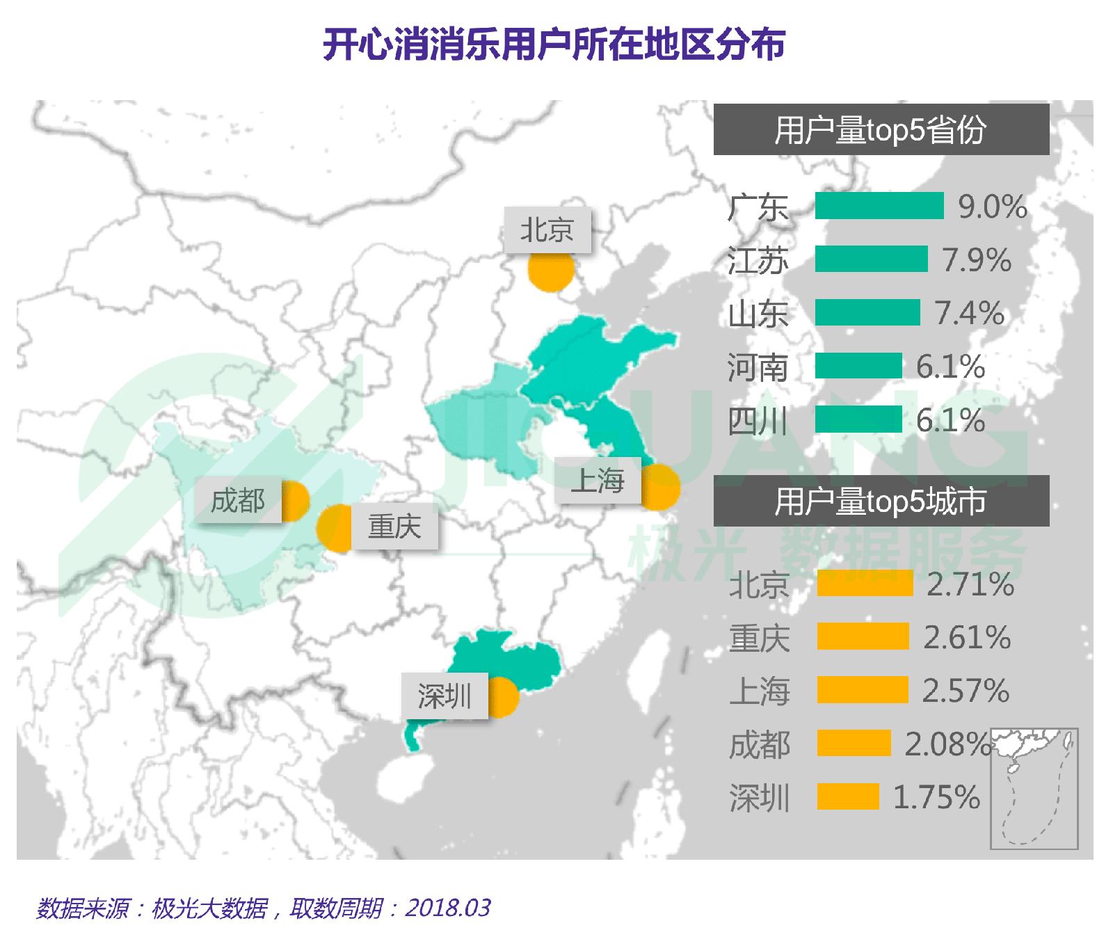 根据极光大数据显示,广东、江苏、山东为开心消消乐用户占比top3省份,开心消消乐用户最集中的城市是北京,这里聚集了2.71%的开心消消乐用户。