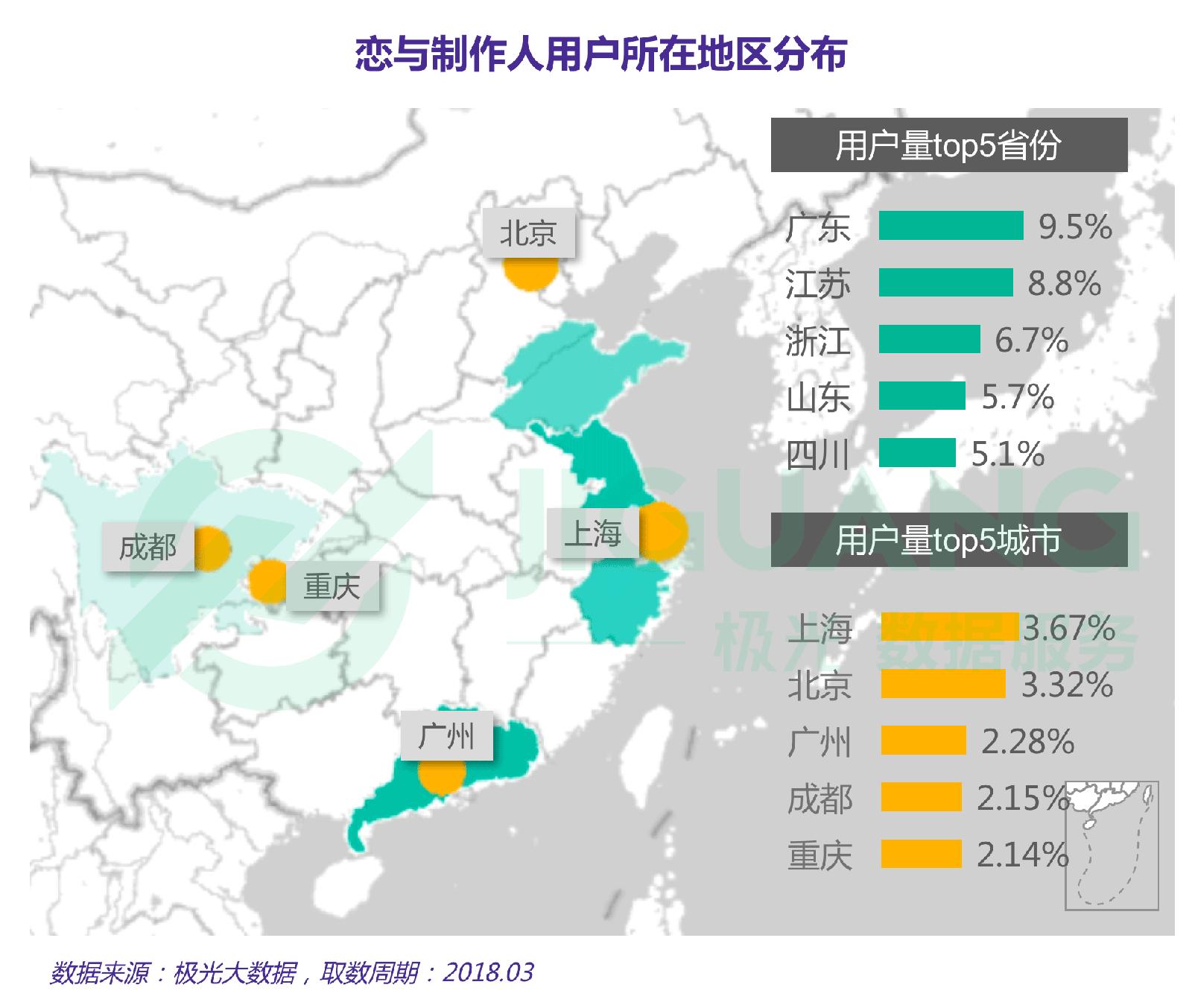 根据极光大数据显示,广东、江苏、浙江为恋与制作人用户占比top3省份,而上海则是恋与制作人用户最集中的城市。