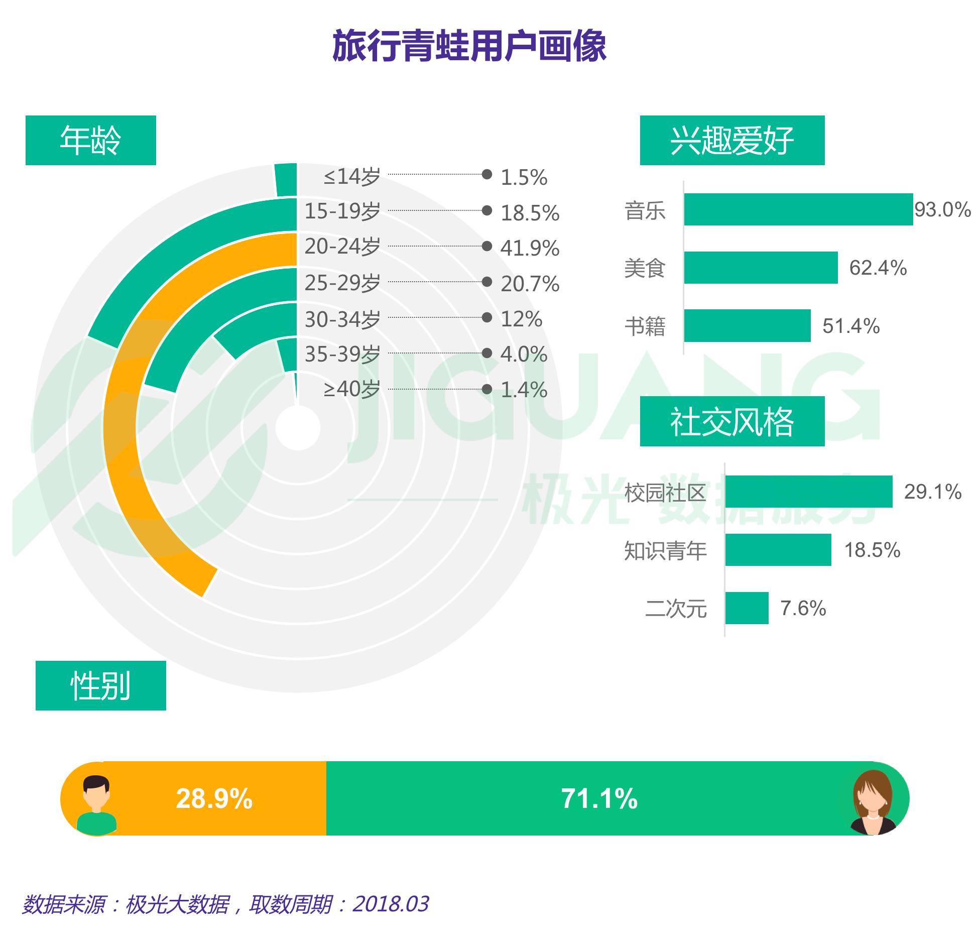 根据极光大数据显示,旅行青蛙用户中41.9%为20-24岁,女性用户占比为71.1%。