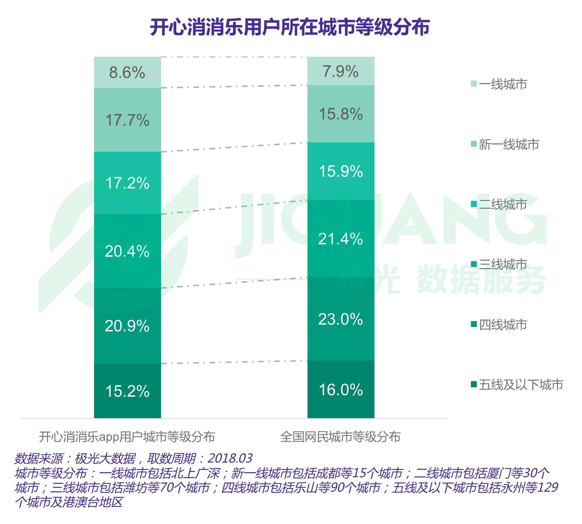 极光大数据发现,开心消消乐用户在一二线大城市相对更为集中。开心消消乐用户中43.5%来自一线、新一线或二线城市。