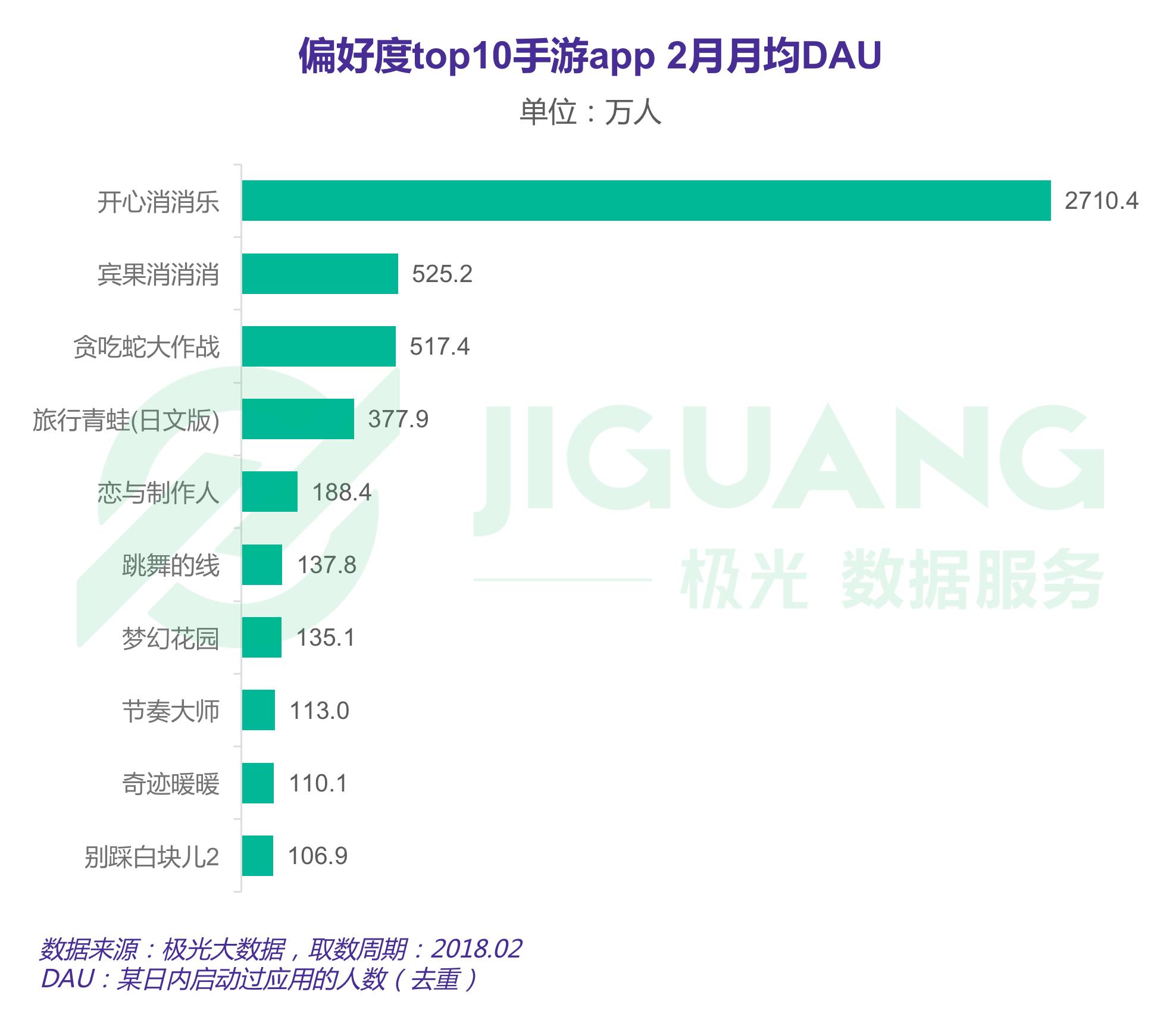 根据极光大数据显示,2018年2月,开心消消乐月均DAU为2710.4万,宾果消消消为525.2万,贪吃蛇大作战为517.4万。