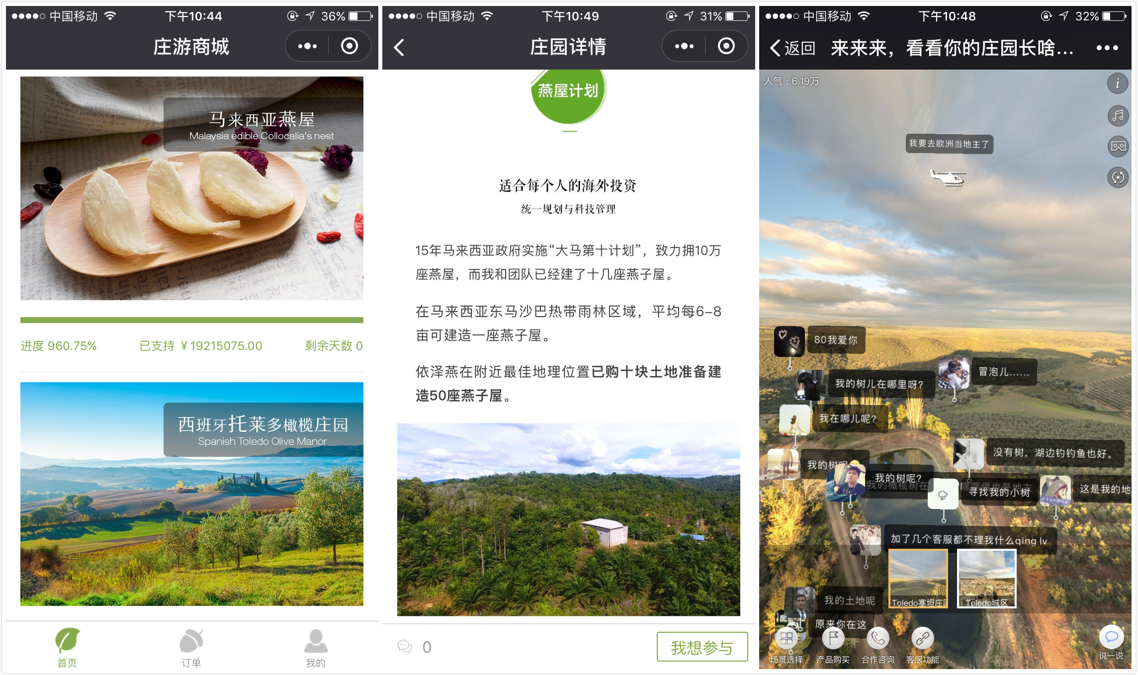 「庄游」成立于2016年,是一个共享庄园社区。用户最少花200块钱,就能成为一个海外庄园的“庄主”。“庄主”的权益包括:只需市场价格的三分之一,就能买到源头可追溯的健康食品,比如燕窝、人参、橄榄油、葡萄酒等;投资型用户也可以选择出售产品给其他用户,收益率在8%-15%不等;在旅游层面,用户可以到庄园免费度假、举办派对或婚礼,体验庄园生活。