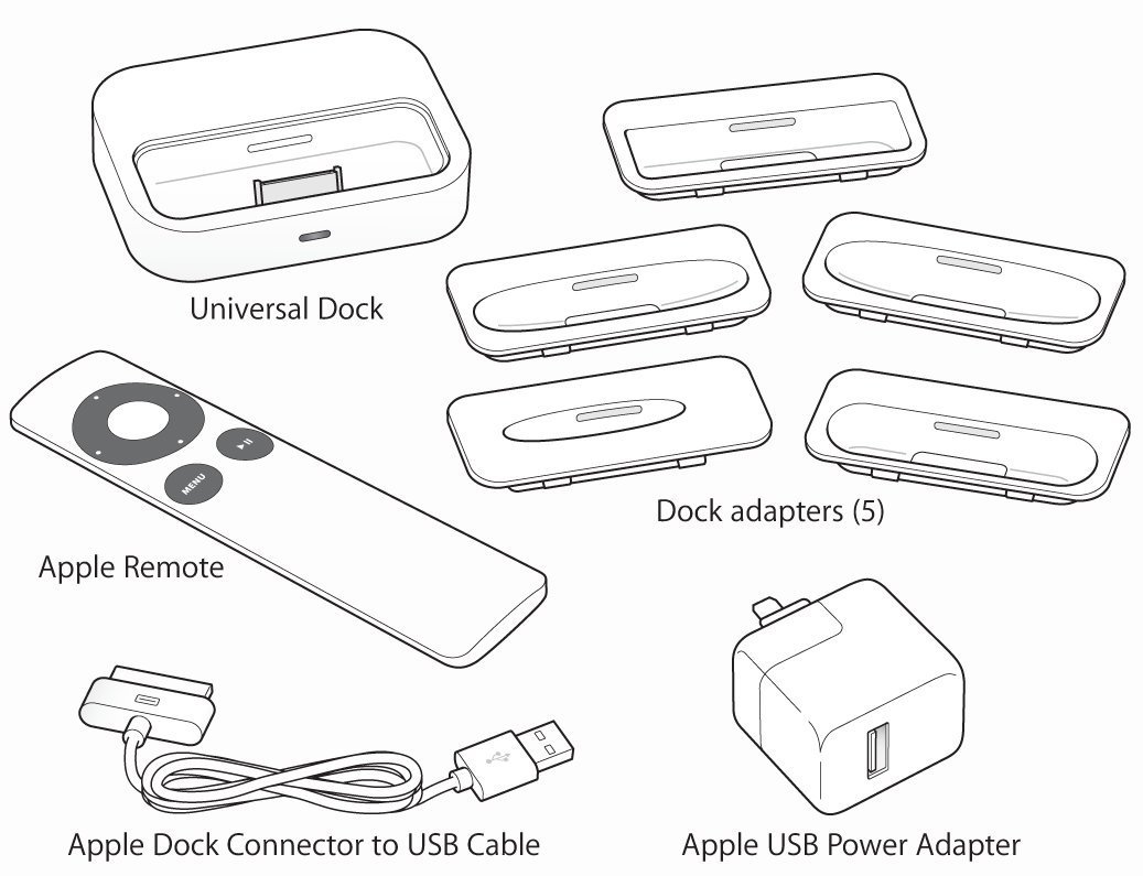 在 30-pin 接口仍未被抛弃的 iPod 时代,苹果在 2005 年起开始单独销售基于第四代 iPod 设计的底座,可以用来和电视连接并观看照片;由于当时众多 iPod 设备的尺寸大小各不相同,所以在之后的底座套装里一般会内置各种转接环,还有独立的 Remote 控制器,方便控制 iPod 和 iPhone 播放音乐。