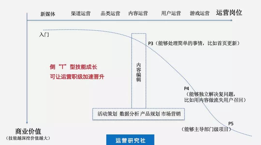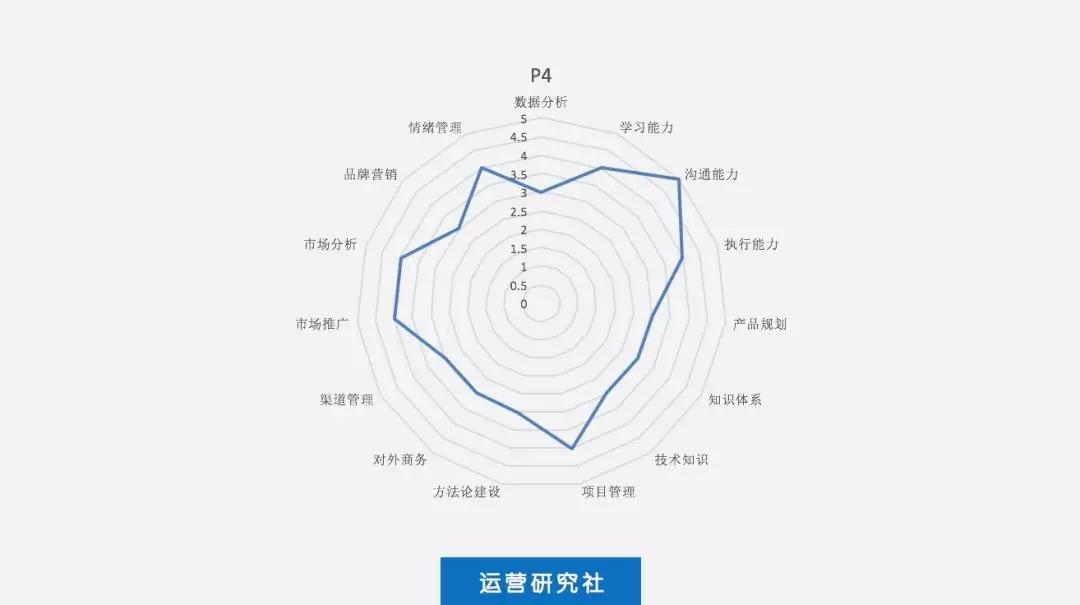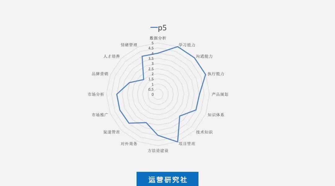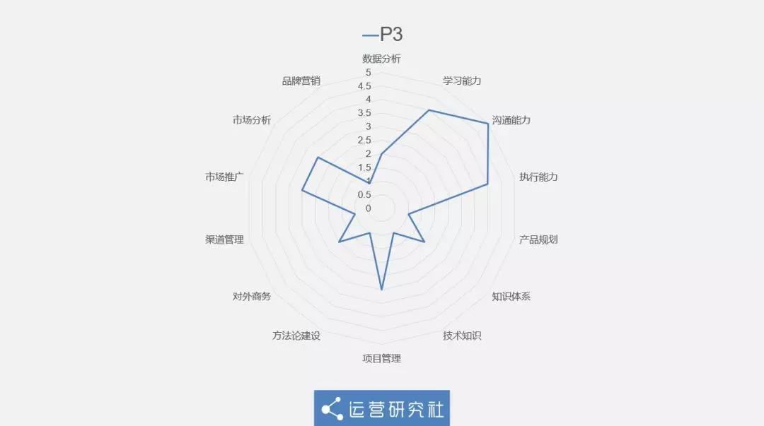 那么入门级和 P3、P4、P5 的成长关键在哪呢?除了入门级(这部分人群我会单独讲到),我觉得主要是靠技能。通常这个阶段的运营都会有自己明确的岗位方向,只需要掌握 1-3 个垂直技能就差不多可以做得蛮好。
