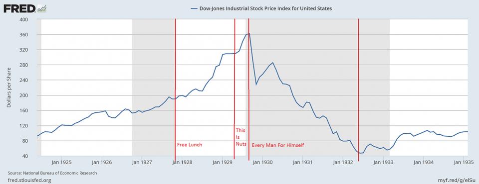 事实是比特币的价格于2月回升并不意味着它在恢复。以下这张图展示了历史上最有名的股市崩溃。