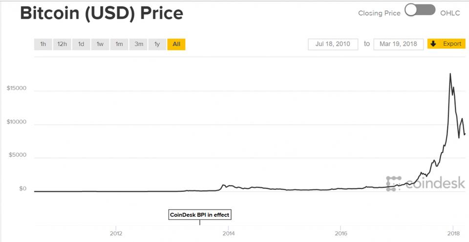 上图反映了2010年至2018年比特币价格波动情况。