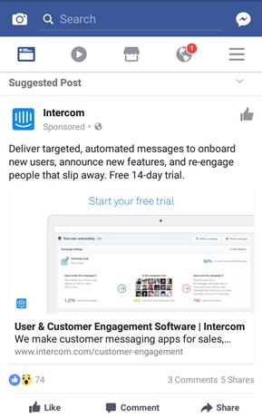 当然,Intercom也将重新定向作为一种提高转化率的策略。如果你在他们的网站上阅读内容,然后跳转到Facebook,你可能会看到一个广告,邀请你免费试用他们的软件。