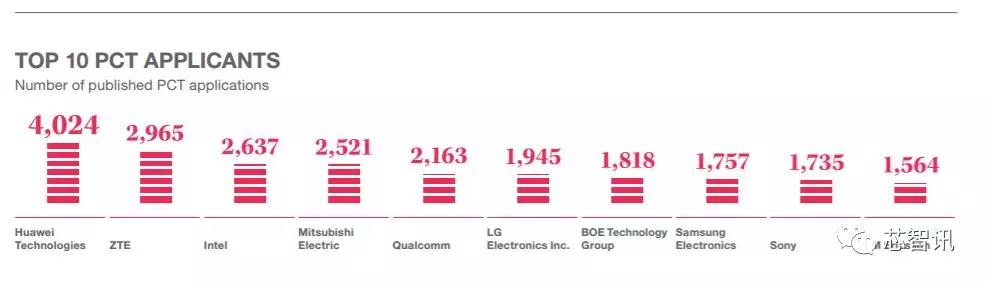 从具体企业PCT专利申请数量排名方面来看,中国的华为和中兴通讯分别以4024件和2965件占据全球第一、第二位,领跑全球。