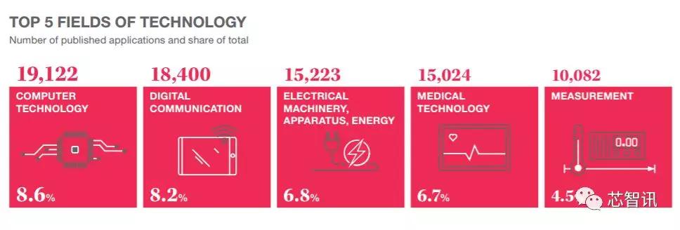 2017年,计算机技术相关的专利申请量达到了19122件,占比8.6%,取代了数字通信(18400件,占比8.2%)成为了专利申请比重最大的领域。紧随其后的是电力机械(15233件,占比6.8%)、医疗技术(15223件,占比6.7%)和测试(10082件,占比4.5%)相关。